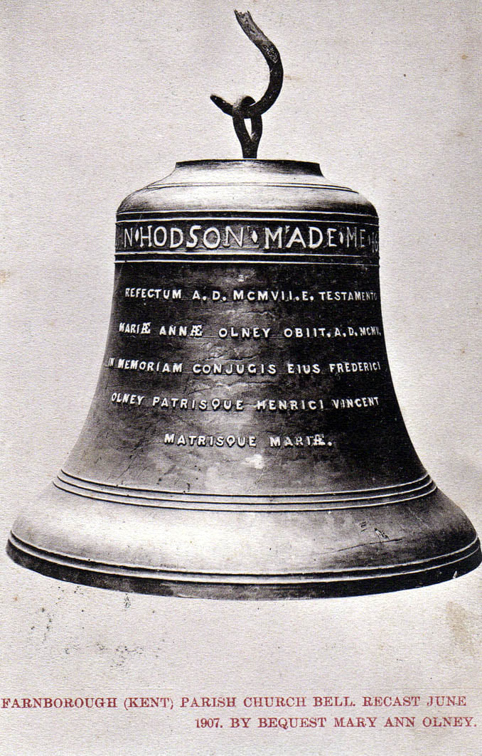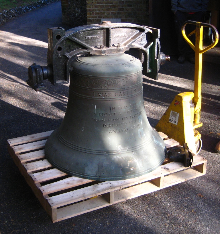 1951 28th Jan. Bell cast by Gillett & Johnston using metal from the old bell. It was hung in a new cast iron frame and cost £282. The old clock from the Stables at The Rookery, Bromley Common (a large house which once stood on what is now the Bromley College of Technology), was purchased for the church for £25 and refurbished by Gillett & Johnston. The clock strikes the hours on the 1766 bell which possibly came from The Rookery also.