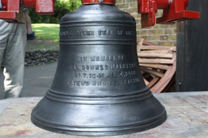 The second phase of the bell installation resumed on Tuesday 26th June 2012, when the G&J bell was delivered to Farnborough to be reinstalled in the tower. It arrived together with its frame sides and fittings, and fortunately there was a goodly gathering of helpers at the right time in the afternoon to unload it from the van and then trolley it to the base of the tower.During Wednesday and Thursday the stays were fitted as were the new pendulum sliders, which were then suitably adjusted. All this work was either done or overseen by the other Paul Mason from Loughborough. A number of helpers were enlisted on a daily basis to help with aspects of the work, and great thanks are due to them. Some helpers were from other towers in the District and indeed from other Districts.