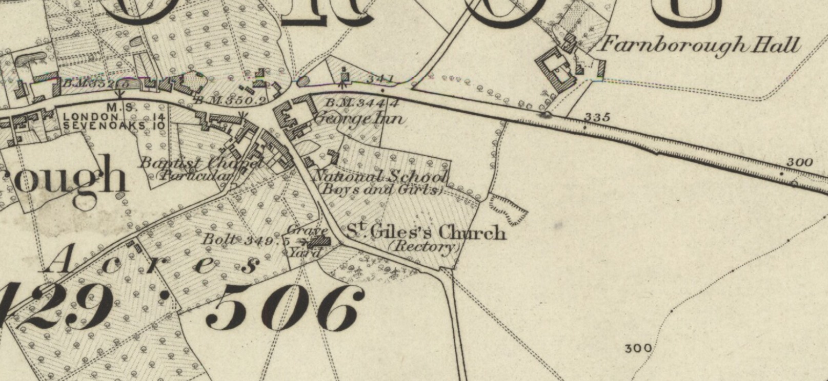 This is an early Ordnance Survey map dated to 1880. It shows many changes from a modern map. The church is there of course, but the main churchyard is not, as the land it now occupies was purchased from the Lubbock family at around the time the map would have been surveyed.