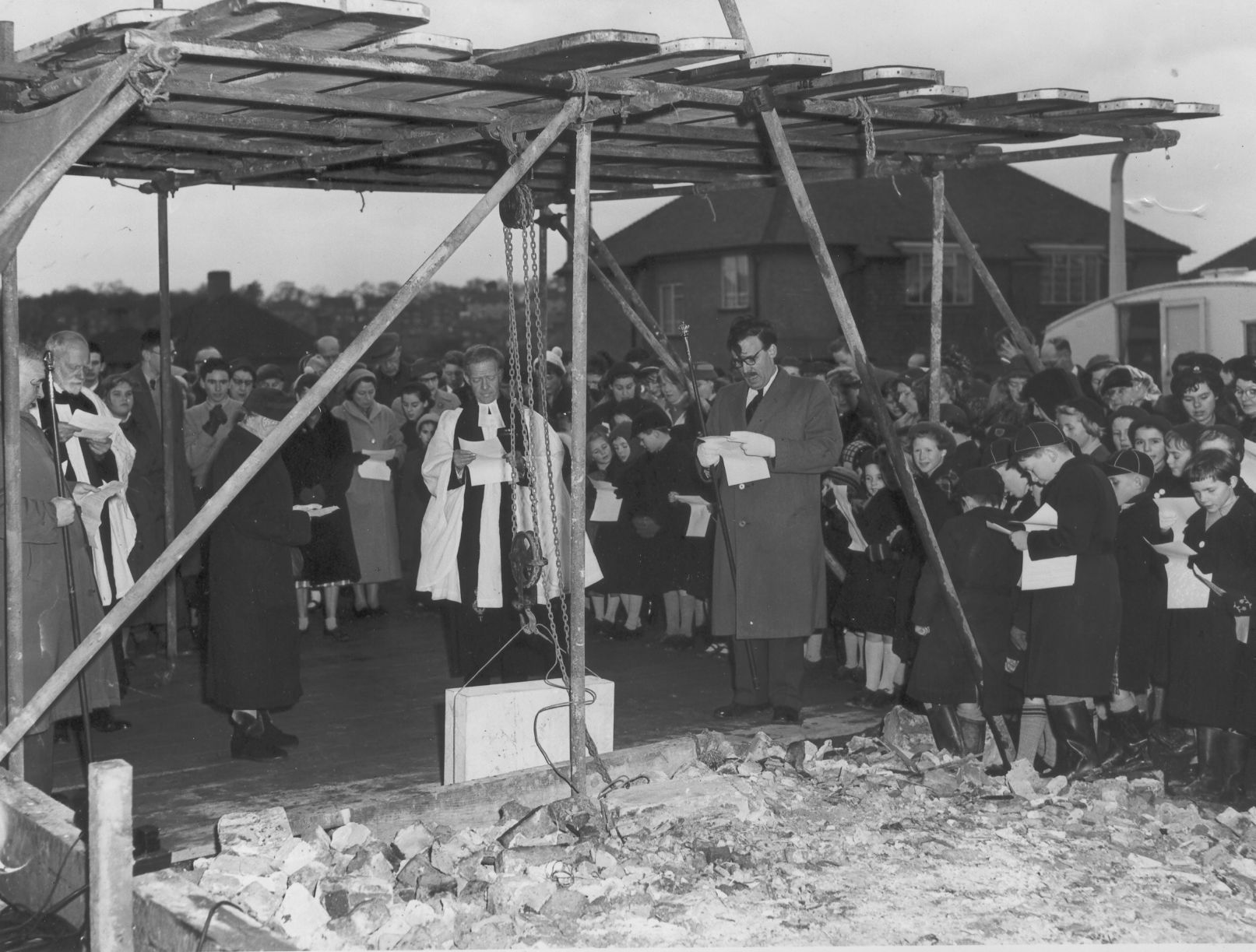 After the extremely slow (and sometimes negative) progress that had been made during the past years, events now moved with almost breath-taking rapidity. The ground was quickly cleared and on Sunday, 8th December 1957, at a simple but inspiring ceremony witnessed by a large assembly, the Foundation Stone was laid by Mrs. Guy Warman. This was a most happy choice as it gave the Rector and Church Council the opportunity of showing their appreciation for the counsel and guidance so freely given by the late Bishop Guy Warman during his residence in the parish.