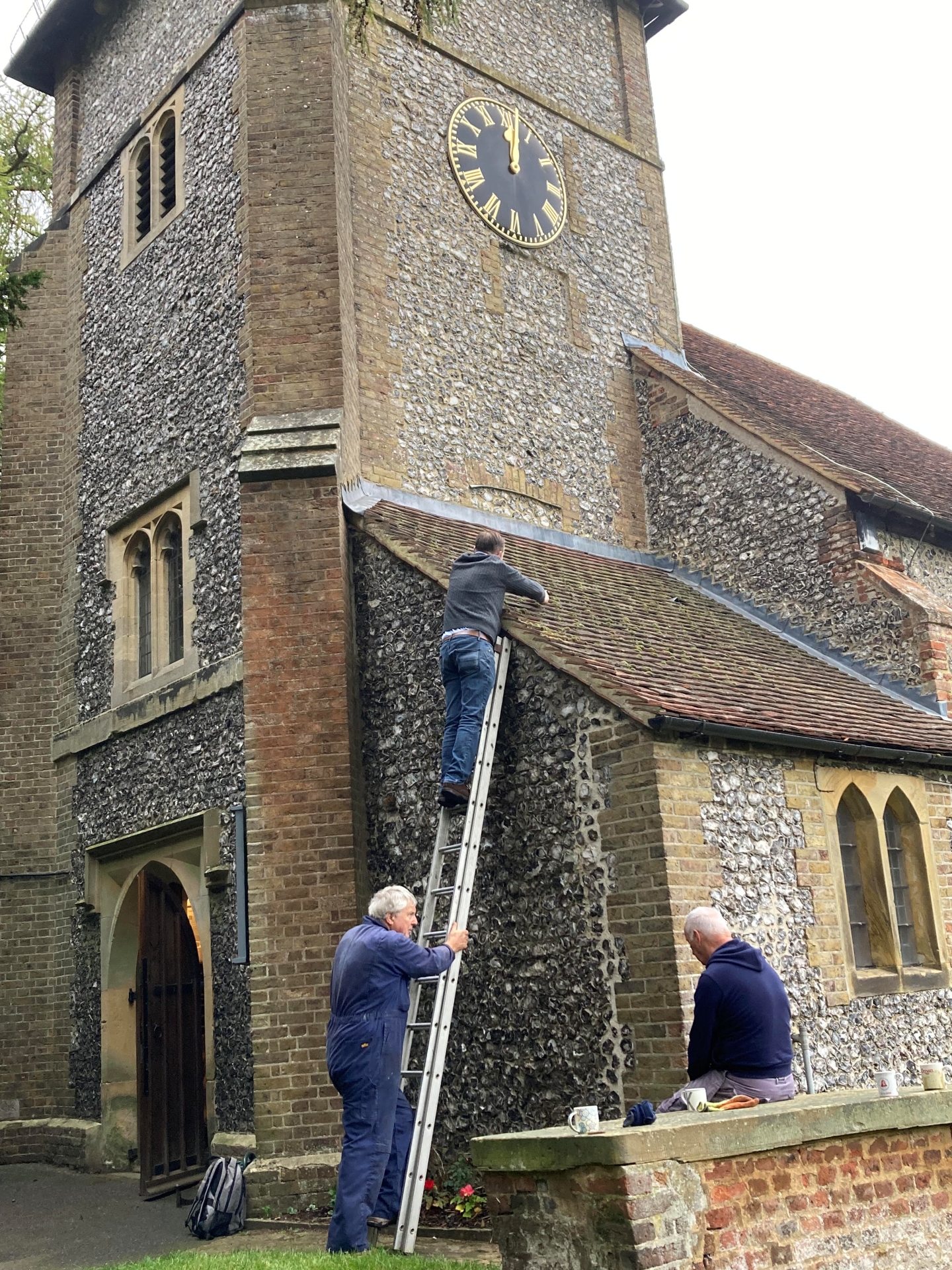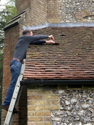 Also, there are certainly some jobs the clergy undertake that may not be in their job description. The two photos to the right above show Matthew attending to the clergy vestry roof at one of our Tuesday morning working parties.
